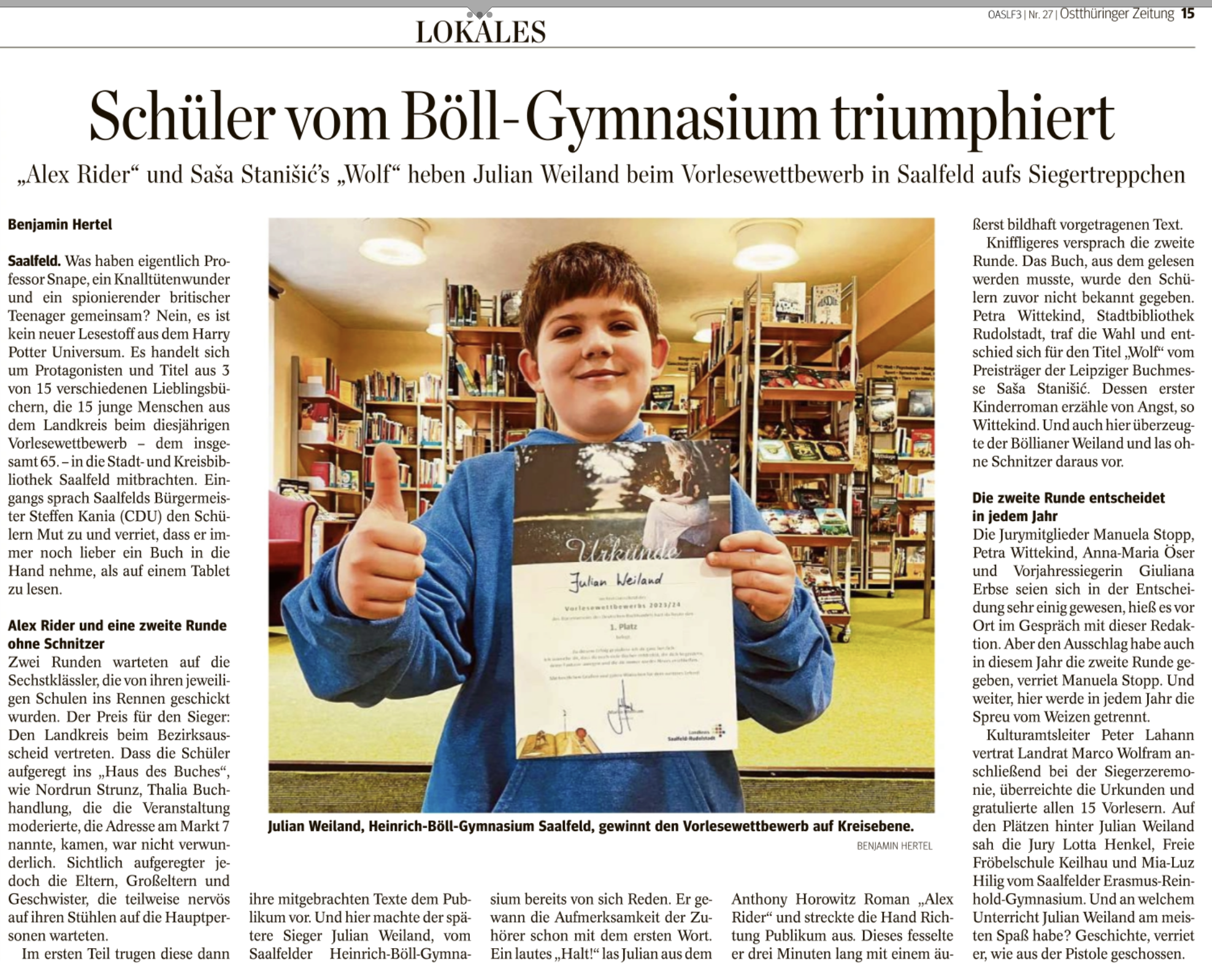 ... mit Klick auf das Bild zur vergrößerten Ansicht Glückwunsch an Julian Weiland zum Sieg beim Vorlesewettbewerb im Landkreis Foto: OTZ / Benjamin Hertel ... mit Klick zum OTZ-Artikel vom 01.02.2024