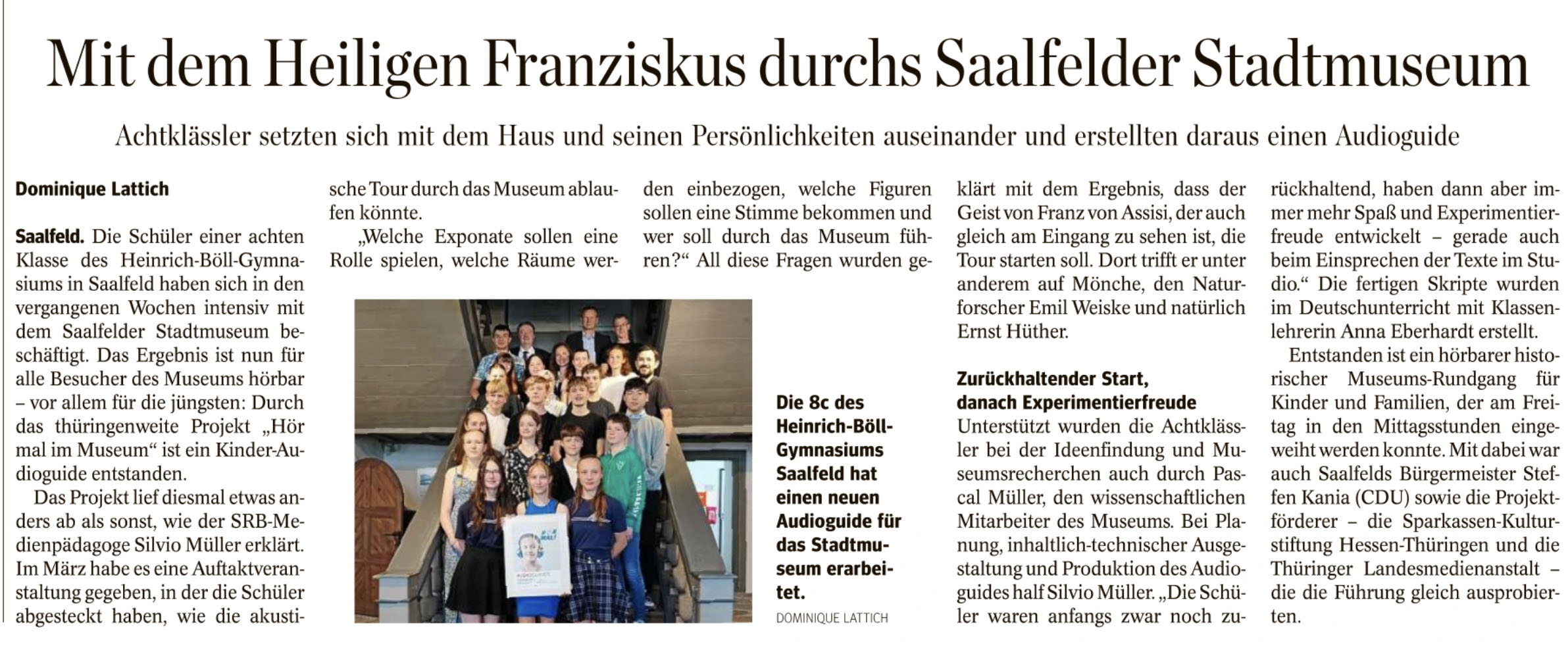 Franziskus wurde von unserer Klasse 8c zu neuem Leben erweckt. Am letzten Freitag (09.06.2023) stellten die Schüler*innen unserer Klasse 8c im Stadtmuseum Saalfeld den von Ihnen mit viel Aufwand, Kreativität bei den selbst verfassten Beiträgen und mit beeindrucken Sprechleistungen erstellten Audioguide für einen Rundgang durch das Stadtmuseum vor. Entstanden ist ein bemerkenswerter historischer Museumsrundgang, der nicht nur bei der Zielgruppe "Kinder und Familien" viel Anklang finden wird - und auf den alle Beteiligten zu Recht stolz sein können. Mit Klick auf das Bild kann der OTZ-Artikel zur Vorstellung des Audioguides aufgerufen werden oder über den Link https://www.otz.de/regionen/Saalfeld/akustischer-museumsfuerer-fuer-das-stadtmuseum-saalfeld